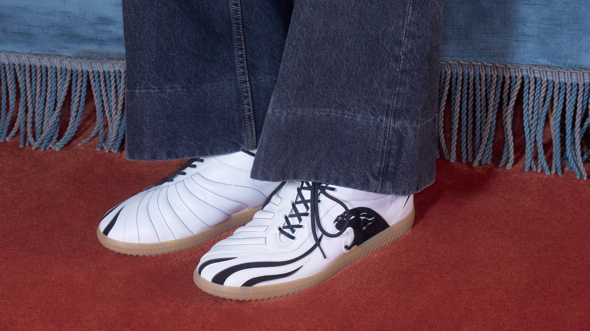 Low-top sneakers in sleek nuances are punctuated by an iconic band, creating a 70s-inspired aesthetic.