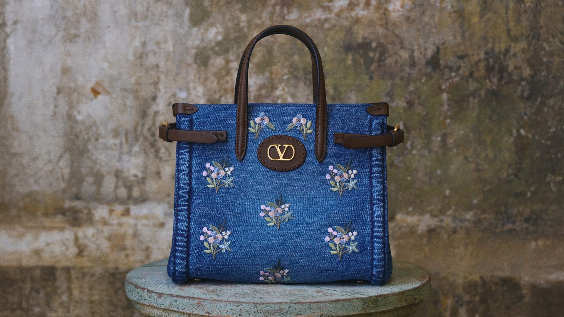 • Valentino Garavani Vlogo Signature Mini Top-Handle Bag In Denim With Floral Embroidery