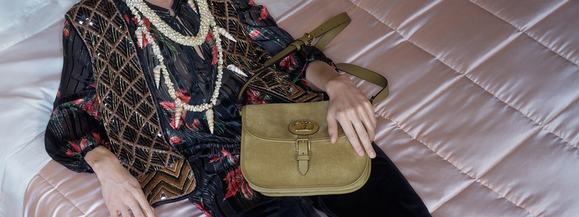 The Valentino Garavani Nellcôte crossbody, tote and belt bag styles in suede accompanied by the Maison’s signature stud reveal an eclectic 60s allure.