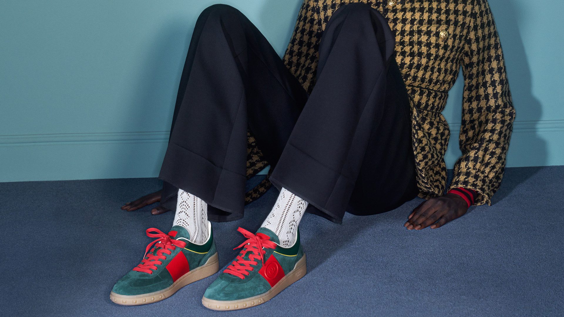 Low-top sneakers in sleek nuances are punctuated by an iconic band, creating a 70s-inspired aesthetic.
