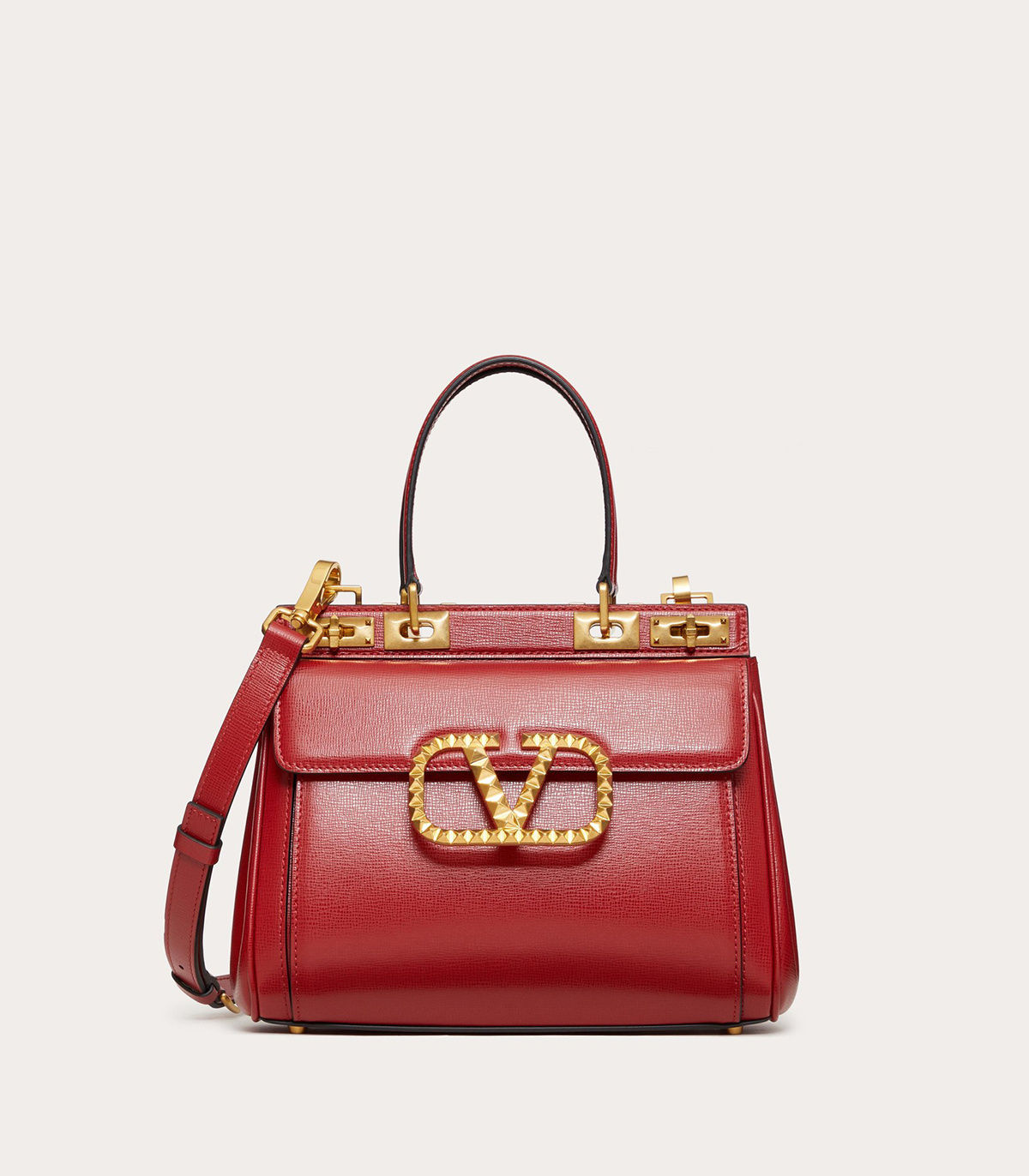 Bold studs and golden locks play a game of sensual and feminine contrasts, the bag reveals an alluring red nappa lining.