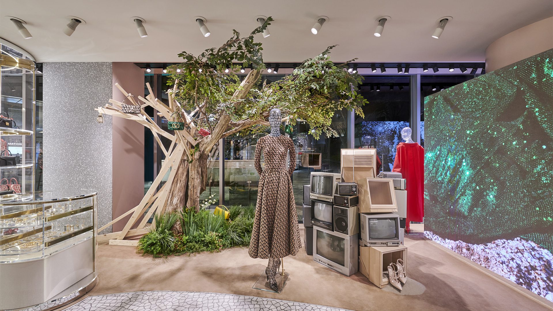 “When I first saw the collection, I was inspired by the elegant silhouettes and intricate embellishments; each look was like a peacock spreading its wings. I wanted to bring that element of nature into my installation, marrying the organic with the human made. It’s about a balance, between human artifacts and what the Earth provides to us; a constant conversation.”