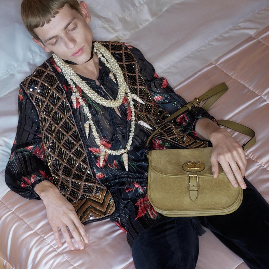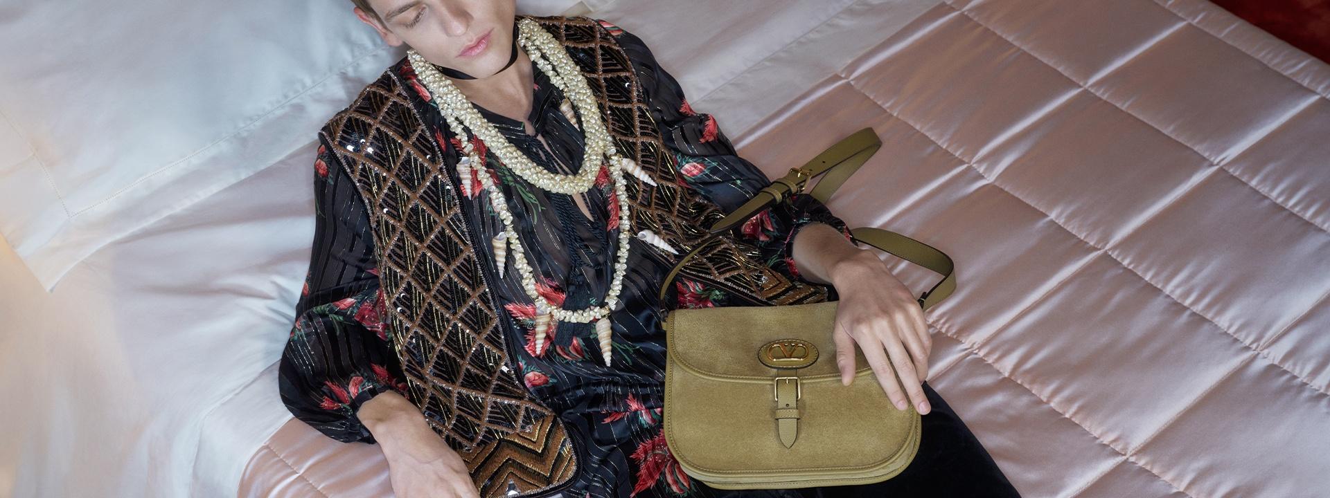 ヴァレンティノ ガラヴァーニ アンティーブが、2サイズ展開のクロスボディバッグとして再解釈されました。曲線的なラインとバックル付きフラップ、パッド入りトリムがシルエットを形づくり、アンティークブラス仕上げのVロゴ シグネチャーパッチがカーフレザーまたはスエードであしらわれています。